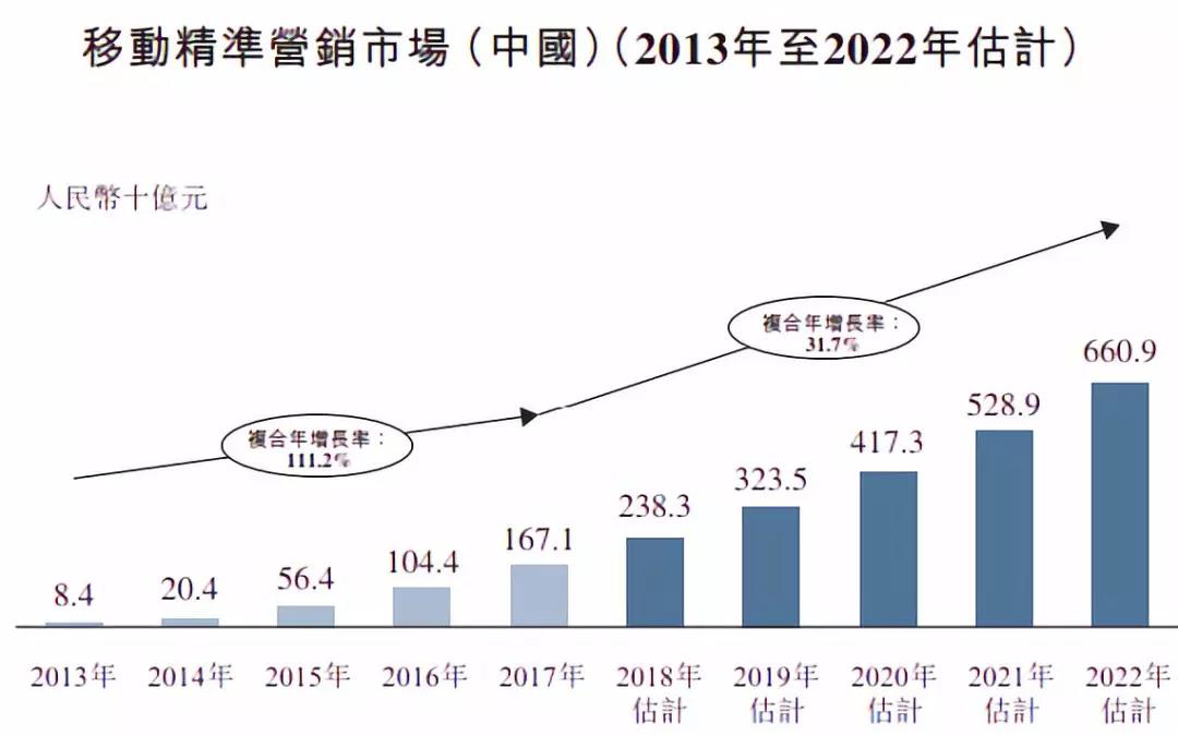 根据弗若斯特沙利文报告,预计中国移动精准广告市场规模将以31.7%的复合年增长率自2017年的1,671亿元增长至2022年的人民币6,609亿元。