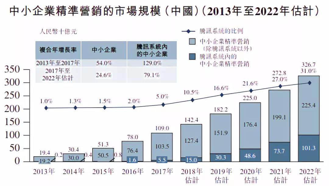 当中,中小企业精准营销市场的规模亦预计能由2017年的1,090亿元增加至2022年的3,267亿元,而腾讯的社交平台的市场份额亦将会逐步增加。
