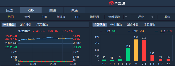 昨日恒指高开高走,收盘大涨2.27%至26462.32点,全日成交额达1127.29亿。国企指数涨2.22%,报10358.21点,红筹指数涨1.89%,报4230.01点。