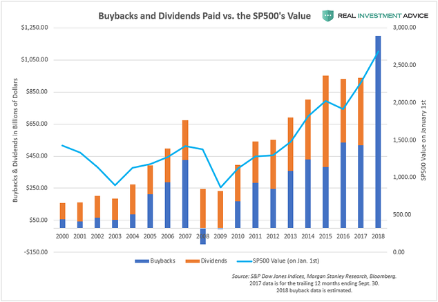 美联储近十年的低利率政策催生了目前的公司债务泡沫,大量上市公司将债券市场获得的融资用于回购股票,下图可见09年以来股票回购稳步攀升。同时,17年通过的税制改革法案导致18年的股票回购潮。