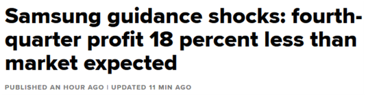 紧接着1月8日,三星集团2018年第四季度初步财报预计,由于内存价格压力,公司营业利润10.8万亿韩元,低于分析师预计的13.2万亿韩元,环比下降38.5%,创下7个季度最低水平。