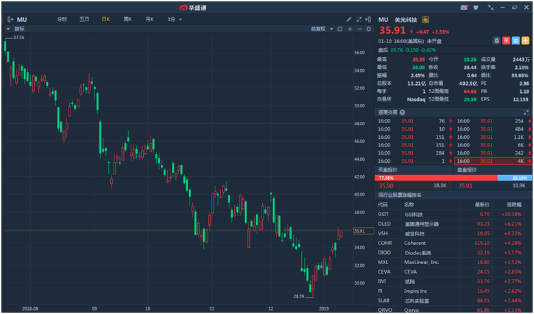 因为成本结构的因素,美光相比韩系两大厂商偏弱,公司对于承受价格下跌的空间较小,因此引发的股价反应较大,公司在经过一年的深幅下跌之后,有分析师认为公司2019年的表现应会好于整体股市。