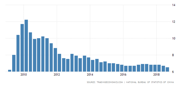 下图是中国近十几年来的GDP增速变化图,最近的增速为6.5%,而过往最高的年化增速要超过12%,而美国目前的增速则为3.4%。6.5%的增速依然相当高了,而且中国需要保持较高的增速来应对过高的政府、公司和居民债务问题。据彭博,中国的债务杠杆已经达到了GDP的265%。另一方面,这也是政府进行大规模的1%税减的重要原因。