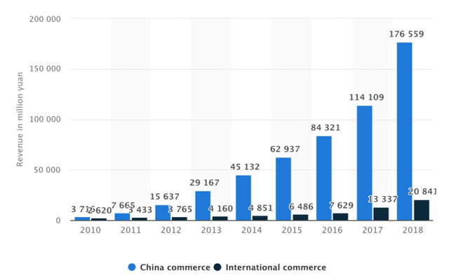 国内收入占阿里巴巴总收入的80%左右,占了绝大部分。2017年到2018年,国内收入同比增长了59.9%,但公司在过去四个季度的收入增长曾出现两次意外下滑,受经济下滑、消费不振影响,这次财报估计也会出现这种情况,不过这也应该只是中短期现象。
