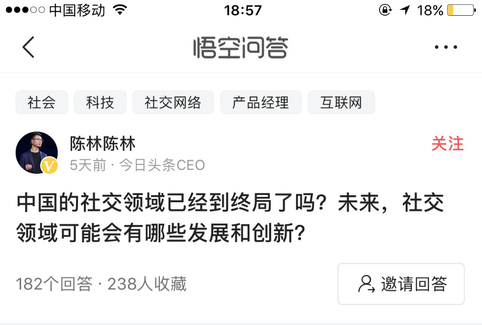 就在几天前,今日头条CEO陈林在悟空问答中提了一个问题:中国的社交领域已经到终局了吗?未来,社交领域可能会有哪些发展和创新?