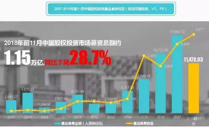 上年2018年,一级市场出现了突如其来的资本寒冬。根据数据显示,2018年前11月中国股权投资市场共募集金额接近1.15万亿,同比下降了28.7%。