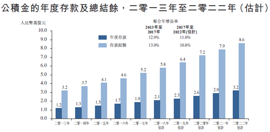 在我国住房公积金为强制性月度储蓄计划,提供自筹资金的住房信贷,2013-2017年公积金年度存款稳步增长,从1.2万亿增长到1.9万亿,年复合增长率为12.9%,预计2017-2020年将按年复合增长率11%进一步增长。