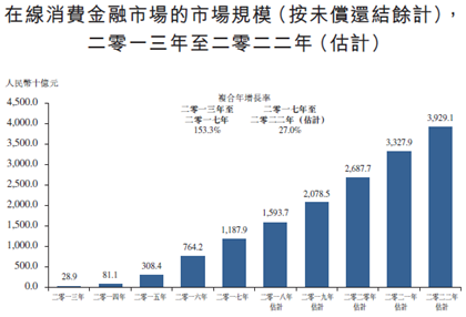 目前,随着移动互联网的深度渗透,移动支付、互联网消费等发展,特别是千禧一代及年青一代中,在线消费金融深刻影响人们的生活,按未偿还介于计算,我国在线消费金融市场规模在2013-2017年由289亿元增长至11879亿元,预计到2022年规模将达到39291亿元。