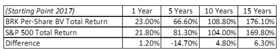 伯克希尔哈撒韦的资产组合主要覆盖八大行业:航空运输、房地产、铁路、饮料、苹果产业链、银行、公用事业以及保险,满足了多样化投资需求,可以看做是对指数替代。从下表可以看出,资产组合与标普500业绩的对比,虽然在5年持有期方面略微落后,但巴菲特的资产组合整体上是优于指数收益的。