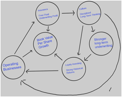 巴菲特旗下的伯克希尔为投资者提供了强有力的护城河。公司在组织架构上市一家私募,拥有一篮子的上市公司股票;而且公司可以对上市公司进行收购从而进行深度管理,这样公司战略将更倾向于巴菲特所鼓励的长期经营理念,而非只图一朝一夕;此外通过公司的内部循环,该机制类似投资界的“飞轮效应”,通过投资被低估标的,鼓励其采用长期经营战略,施以行之有效的改革,改善公司盈利状况,提高公司营运水平,伯克希尔的投资及管理形成良性反馈机制,进一步增加公司的账面价值。