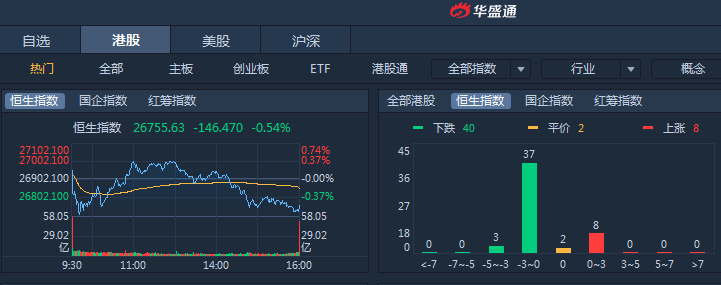 昨日恒指早盘高开0.19%,午后走弱。截至收盘,恒生指数跌0.54%报26755.63点,全日成交额达974.03亿。国企指数跌0.41%报10512.15点,红筹指数跌1.16%报4287点。涨幅前三的为电子消费品、重型机械股及殡葬服务板块,分别涨3.38%、2.25%及1.9%。跌幅前三的为电池、酒精饮料及地产开发商,分别跌5.05%、3.52%及3.45%。