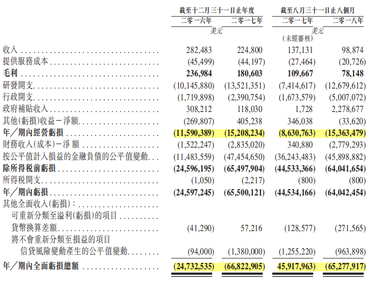 公司2016-2017年以及2018年前八个月分别录得亏损2473万、6682万、6528万美元,但高额亏损的主要原因是公司将优先股计入金融负债公平值变动。将该项剔除之后,同期录得亏损分别为1159万、1521万和1536万美元。主要原因是研发和行政开支的增长,符合未盈利药研企业的普遍情况。
