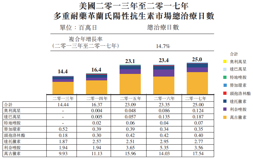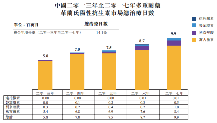 中国市场方面,2017年革兰氏阳性抗生素总销售额为4.5亿美元,预计2023年增长至9.79亿美元,复合年增长率为13.8%。同时,更匹配公司药物治疗的严重革兰氏阳性抗生素治疗总日数在2013-2017年不断增长,复合年增长率达到14.1%。总日数未来可能继续扩大,因此公司主力产品在中国的市场前景较为广阔。