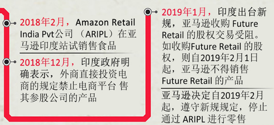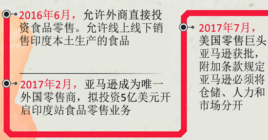 2016年,印度首次批准外国企业对印度的平台型电商公司进行100%的直接投资,零售可采取线上和线下两种方式销售100%在印度生产的产品,帮助当地农民并创造就业。不过,在亚马逊行动之前,很少有外国投资者回应。