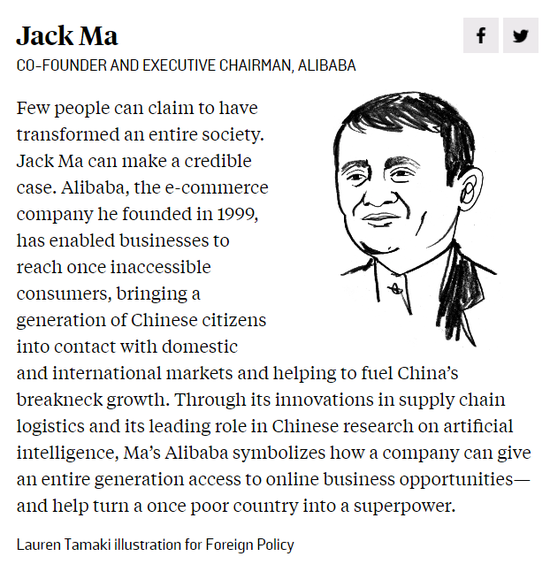 该杂志称:“很少有人可以声称改变了整个社会,马云提供了一个可信的例子。他成立于1999年的电子商务公司阿里巴巴已使企业能够接触到曾经无法接近的消费者,将一代中国公民与国内和国际市场联系起来,帮助推动中国的高速增长。通过在供应链物流方面的创新及其在中国人工智能研究中的主导作用,马云的阿里巴巴象征着一家公司如何能够让整整一代人获得在线商业机会,并帮助一个曾经贫穷的国家成为超级大国。”