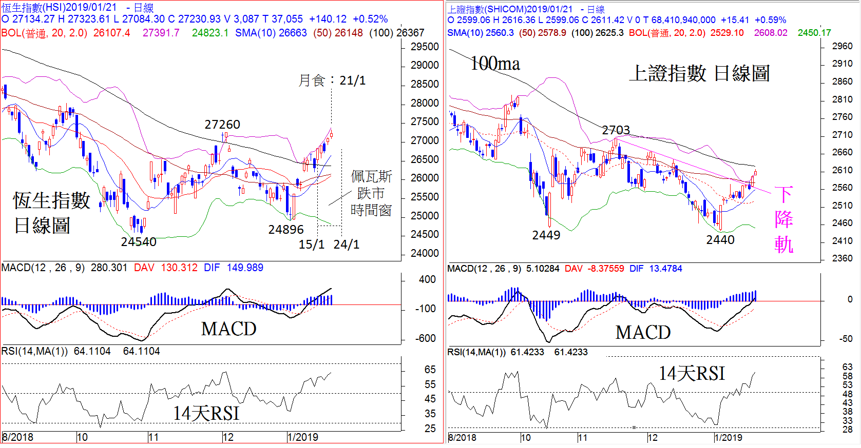 A股方面,上證指數上周五以大陽燭一舉升穿了多個阻力高收,包括:下降軌、50天平均線及20天保力加道上限線,產生突破性升勢的訊號,並正式否定早前所呈現的「頭肩頂」利淡形態。現階段的大阻力是100天平均線2625左右,自從去年2月跌穿了100天平均線支持之後,上證指數從未試過重返其上,所以2625可視為重要的好淡分水嶺。