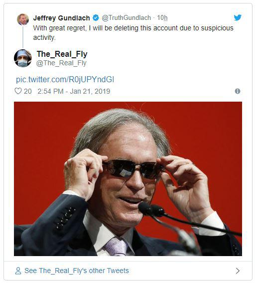双线资本没有及时回复媒体质询,据观察,截至发稿(美东上午周一10点多),Gundlach的推特账号依旧有效。