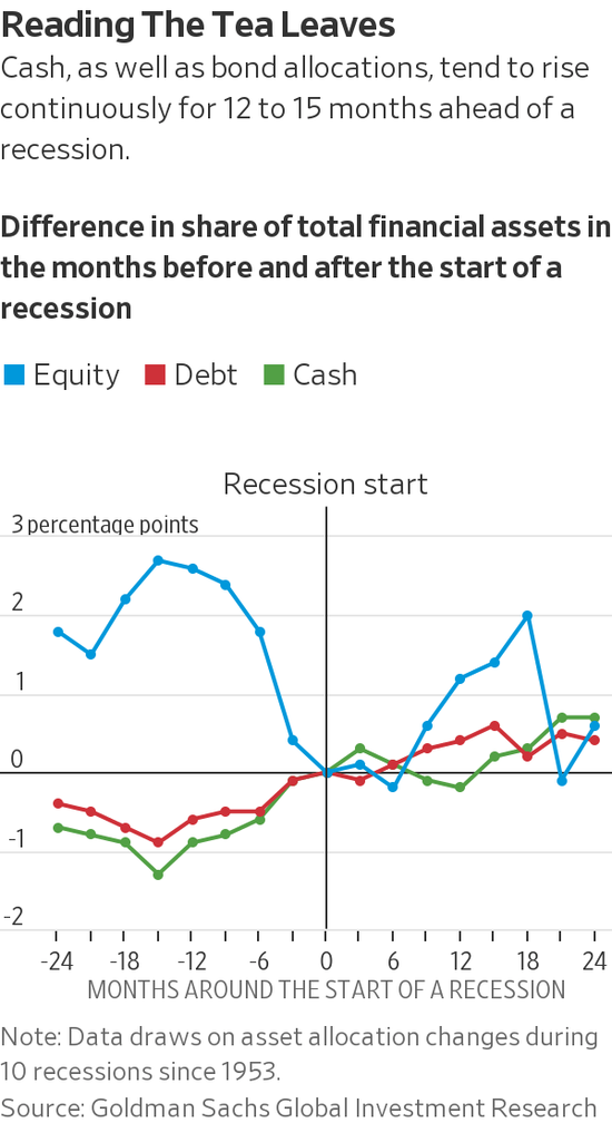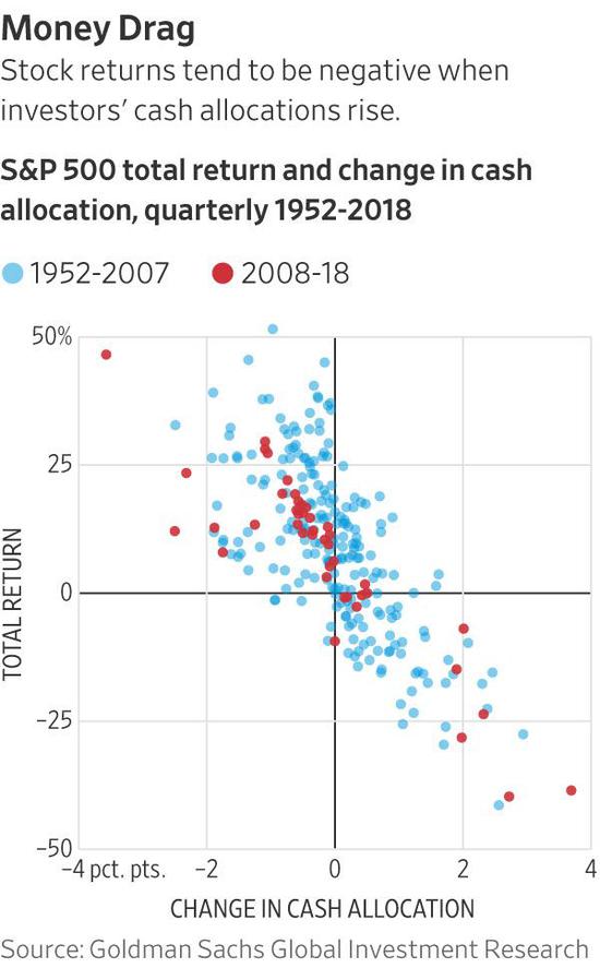 据估计,目前有13%的资产组合中包含现金,相比之下,2018年这一比例为12%,从高盛的数据来看,这是占比最低的年份之一。高盛的数据显示,除了给股票回报率造成压力外,投资者纷纷持有现金还可能释放出经济即将下行的信号,因为在衰退之前的12-15个月里,现金配置比例往往会持续上升。