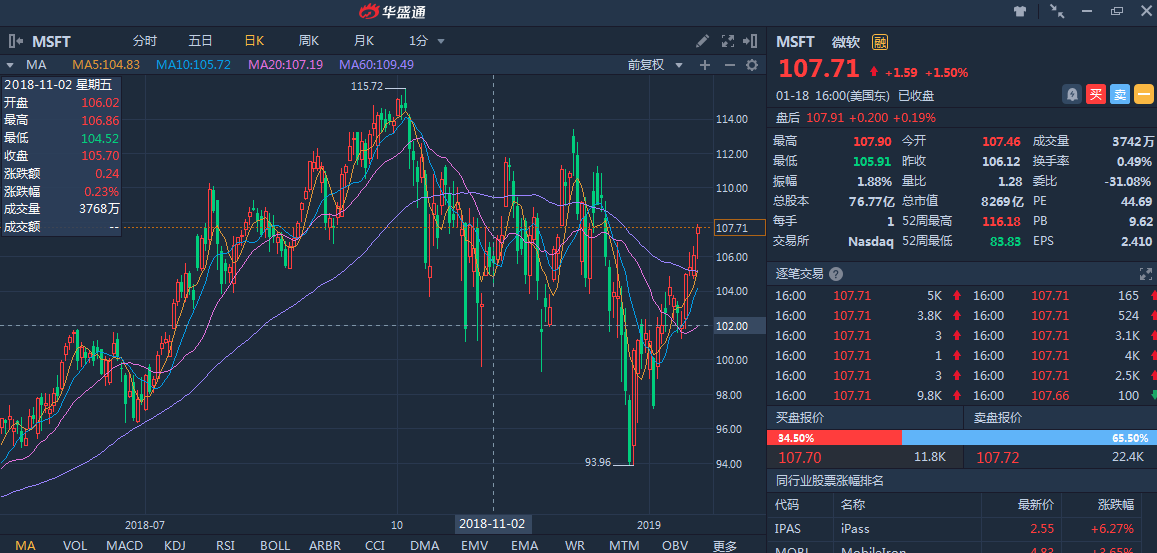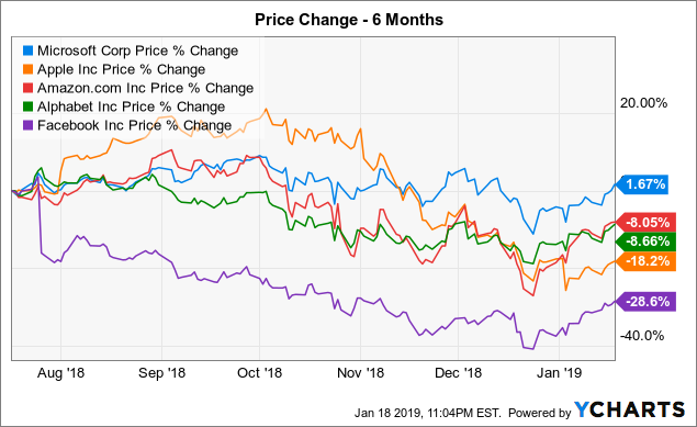 就股价而言,过去半年五大巨头(苹果、亚马逊、谷歌、Facebook及微软)中微软的表现最好,只有其一家实现正收益。苹果因智能机销售疲软,Facebook及谷歌都困于数据隐私问题,公司云计算迅速增长,进一步缩小与龙头亚马逊AWS的规模差距。