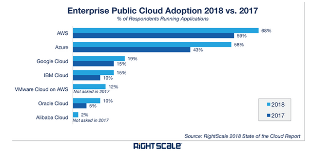 根据Right Scale的调查数据,亚马逊AWS在企业云市场占据绝对优势,受访者使用比例从17年的59%提提至68%。排名第二位的是微软云Azure,受访者使用比例对应从43%提至58%。此外,两家大幅领先市场其他玩家,包括谷歌云、IBM云等,可以说能与AWS竞争一把的只有微软Azure。目前AWS年营收约为200亿美元,考虑到市场快速增长及市场份额提升,相比公司1240亿左右的总营收规模,云计算提升将带来不小整体增益。