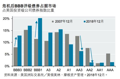德银预计,2019年美国经济依然将保持增长,因此目前还不需要特别担忧企业债务问题,但若2020年美国经济显著放缓或出现衰退,那么如此高占比的BBB级企业债,就会成为市场真正需要担心的问题。