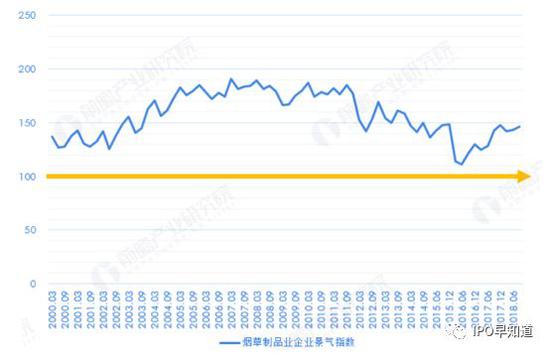 2000-2018年中国烟草制品业企业景气度变化趋势图