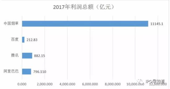 我们最为熟悉的互联网三巨头:百度、阿里、腾讯,2017年税前总利润分别是212.83亿元、796.11亿元和882.15亿元。这些名声鹤立的互联网公司的税前总利润只是中国烟草(11556亿)的零头。