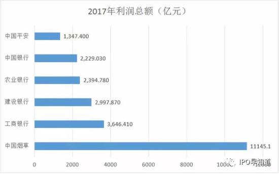 再看A股,最赚钱的前4家企业:国有4大行,也是秒杀级别的差距。宇宙行老大哥(工行)2017年的利润总和位居A股首位,3646.41亿元,但面对中国烟草依旧是小巫见大巫,中国烟草总公司的税利是工商银行利润总额的3倍。