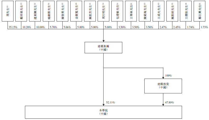 上海建桥学院前身为成立于2000年的民办上海建桥职业技术学院,主席、执行董事及控股股东为周星增。2003年更名为上海建桥职业技术学院,2005年转型提供本科及高等职业教育,并更名为上海建桥学院。目前,该校已建立校企合作项目,包括两个教育部产教融合创新基地,以帮助学生获取技能及就业。该校计划在美国加利福尼亚设立颁授学位的高等教育机构California Gench College,以向海外扩展学校网络。2018年12月,该学院已向上海市教委提交申请,决定登记成为营利性民办学校。公司通过本身及子公司建桥投资持有学院100%股权,如下图所示。集团则是有多个自然人共同持股,大股东为周星增。
