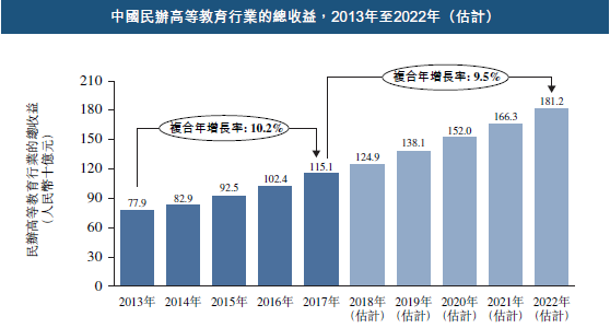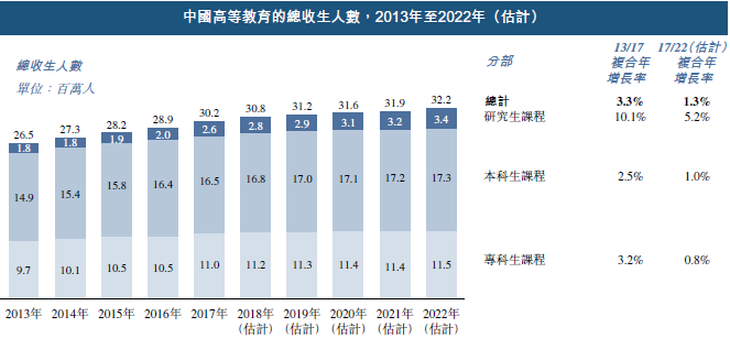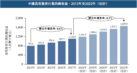 而中国高等教育行业增速要略低于教育行业整体增速,2013年总收入为7976亿元,2017年为11109亿元,符合年增长率为8.6%,预期2017至2022年复合增长率为8.3%,至2022年达到16559亿元。
