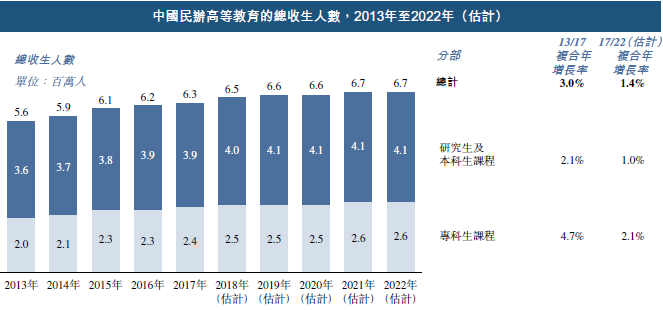 不过,在收生人数上,预计未来将会放缓,2013年至2017年年复合增长率为3.3%,而2017年至2022年预计年复合增长率将会下降到1.3%,增长到3220万人。
