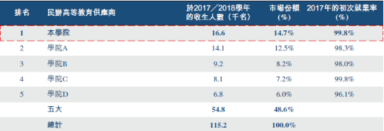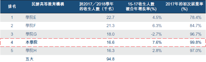 在上海高等教育市场,民办高等教育市场相对集中,在2017/2018学年,按全日制学生入学人数计算,前五大参与者占有48.6%的市场份额,而本学院排名第一,市场份额为14.7,就业率也达到99.8%。而按整个长江三角洲(江苏、浙江、安徽和上海)计,学院排名第四,亦是前五大中增速最大的学院。