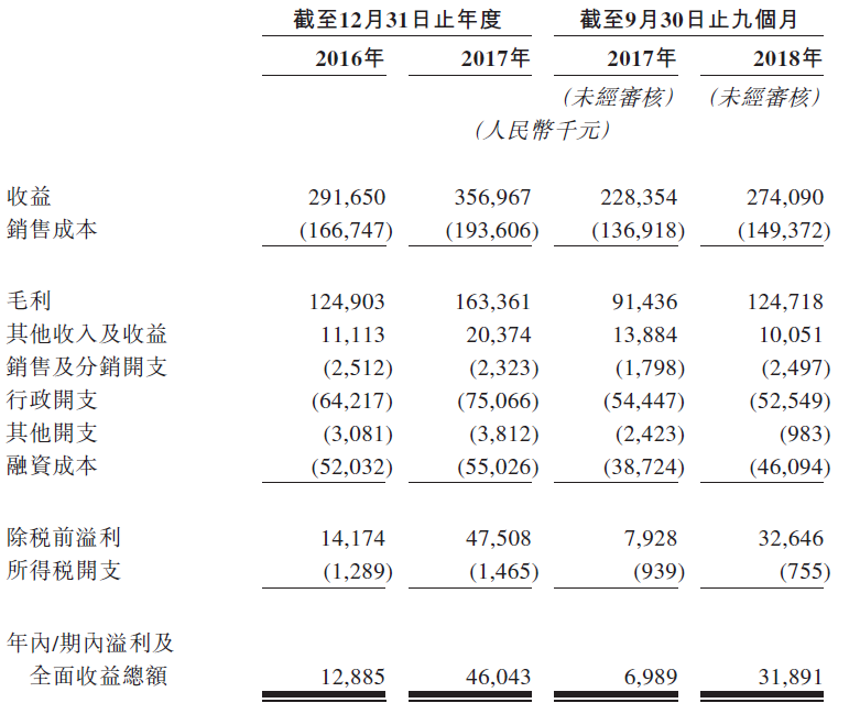 集团收益如下图所示,2016年、2017年收入分别为2.9亿、3.6亿元人民币,2017年同比增长24%,净利润分别为1289万及4604万,2017年同比增长257%,利润增速远高于收入增长。而2018年前九个月利润为3189万,同比增长356%。
