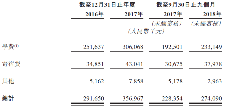 公司的收入主要来源是学生学费及寄宿费,如下图所示,2016年、2017年及2017、2018前9个月的学费分别为2.516亿元、3.061亿元及1.928亿、2.331亿元,保持较高的增速。对于学费收入的确认,公司按照一个学年内按比例确认收入,所以收入增长存在滞后的现象。