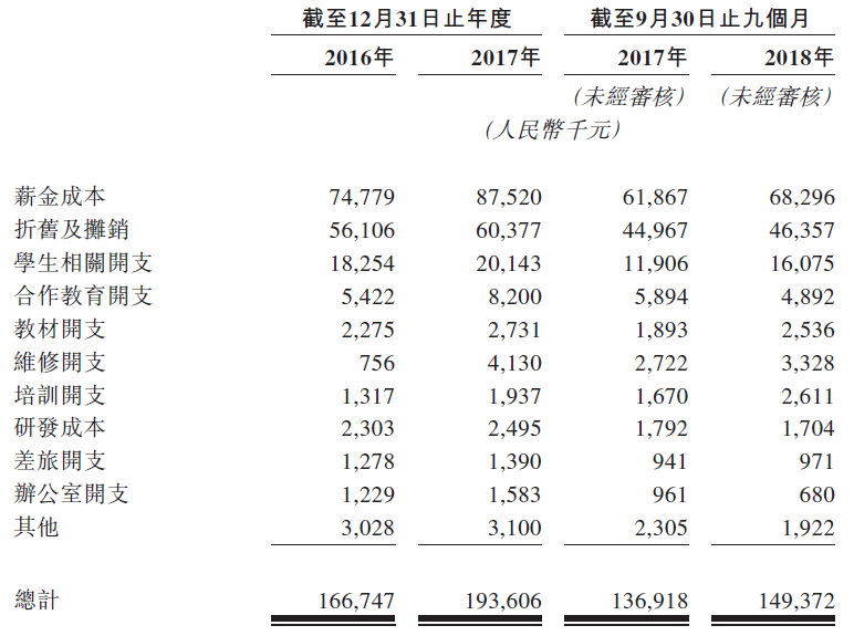 公司成本如下图所示,主要为薪金成本、折旧及摊销、学生相关开支等,其中薪金成本占最大比例,2017年占总成本比例达到45%。