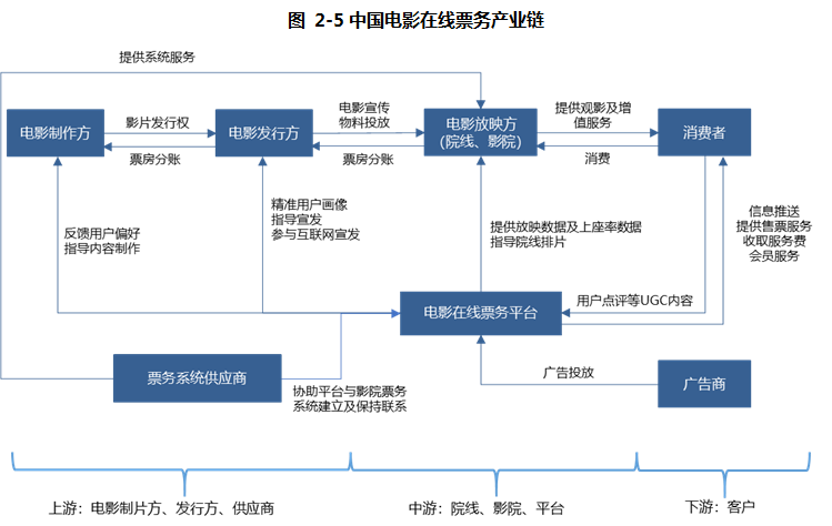 提到票务,就需要涉及当前整个中国电影行业的宏观情况。传统上,电影行业也由不同的上下游环节所组成,一部电影从生产到和观众见面,涉及包括电影制作、电影发行和电影放映几个环节。