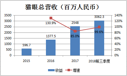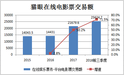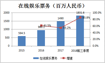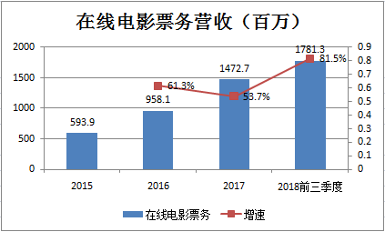 2018年前三季度,猫眼在线娱乐票务营收18.32亿元人民币,同比增长85.8%,其中在线电影票务占97.3%占据绝对主导地位。