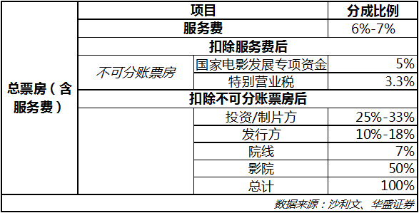 从一个典型的国产电影分成框架来看,根据弗若斯特沙利文咨询公司的数据,在扣除国家电影发展专项资金5%及特别营业税。3.3%之后,整个可分账票房中,各环节的分账比例为:投资/制片方25-33%,发行方10-18%,院线7%及影院的50%。而线上票务平台则是在这一整体票房的基础上另行计算服务费,一般为6-7%。