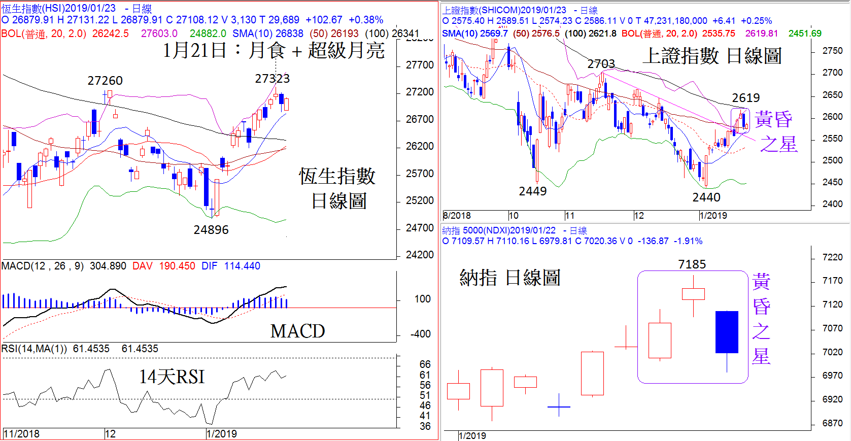 結果,恆指在1月21日創下27323的新高後最終以類似「射擊之星」或「十字星」轉向形態收市,翌日即下跌191點,顯示1月21日的「月食」及「超級月亮」已產生了初步的轉向作用。因此,只要保持在27323的頂部之下,恆指將有條件展開較大幅度的調整。