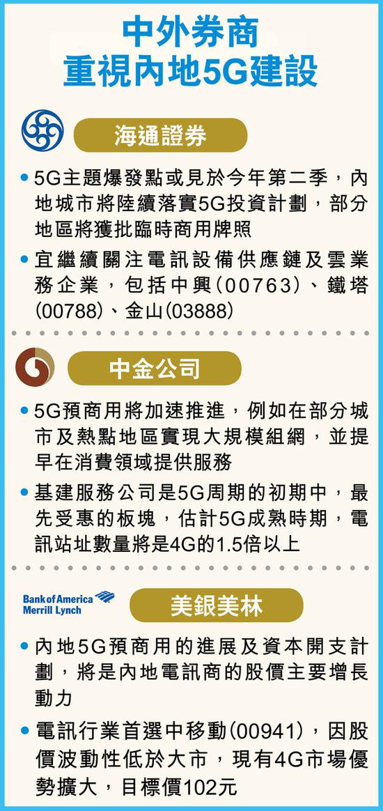 海通证券通讯行业首席分析师朱劲松预期,国内城市将会相继落实5G投资计划,以及在部分重点城市发放商用牌照,估计今年第二季会出现“主题行情的阶段性高点”,去到明年底前仍然是内地投资5G通讯设备的黄金时期。考虑到电讯营运商有机会扩大资本开支,该行建议重点关注5G电讯设备产业链及云服务企业,本港上市的代表包括铁塔、中兴(00763)、中国通信服务(00552)及金山软件(03888) 。