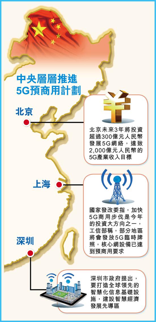 中央政府将5G发展列为今年经济工作重点之一,过去两个月的政策公布一浪接一浪,先有国家工信部上月批出5G试验频谱的使用许可,再联同国家发改委齐声表明加快基建网络铺设,本月11月宣布在部分城市发放5G临时牌照后,北京及深圳市政府随即制定投资方案,力争今年5G预商用的目标。