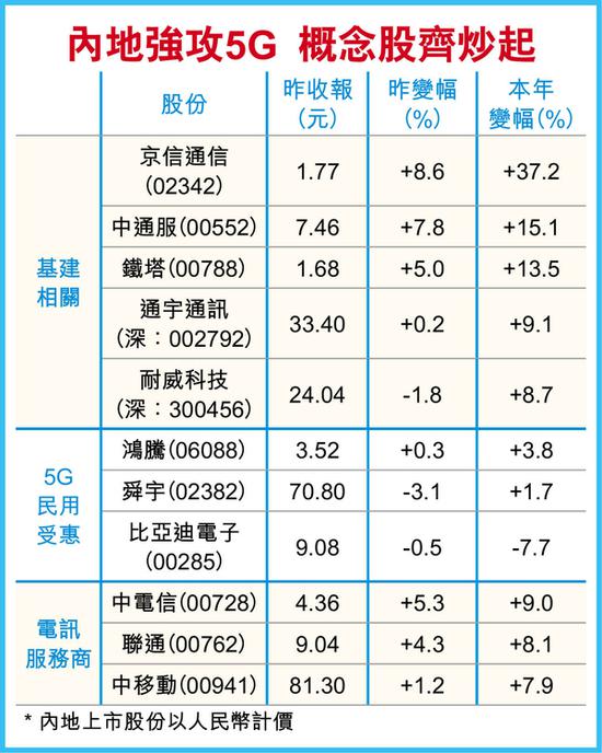 新浪港股讯 据香港经济日报报道,5G发展步伐愈来愈快,概念股近月走势凌厉(详见表),投资者应如何部署?综合投资界意见,现阶段最值博的5G概念股依次为基建及电子设备,电讯发展商则未宜急追。