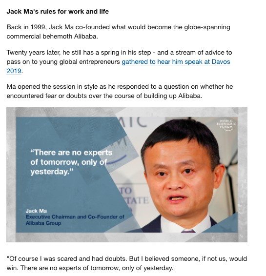 他的观点和英国威廉王子的分享、德国总理默克尔的致辞等一起入选世界经济论坛官方博客当日选出的“十大重要瞬间”。马云金句迭出,论坛为此特意制作了一个视频集锦。文章写道:“早在1999年,马云联合创立了今天成为全球商业巨头的阿里巴巴。20年后,他的步伐依然充满活力——将一系列建议传递给那些聚集在一起聆听他在2019达沃斯讲话的全球青年企业家。”