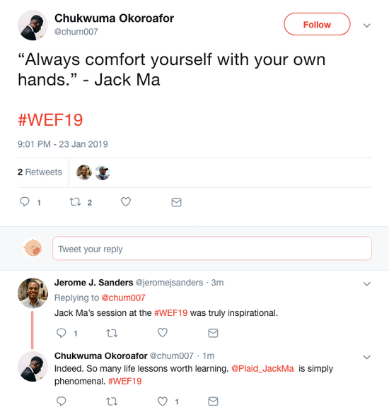 来自尼日利亚的青年律师Chukwuma Okoroafor发Twitter晒出马云的另一个话:“始终用你自己的手来温暖自己”。这是马云勉励青年创业时所说的。他感叹:“有太多人生经验值得学习了。马云就是现象级的人物。”