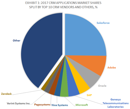 通过下图可以发现,目前CRM软件市场除了赛富时占据25%左右的市场份额以外,市场仍然处于较为分散的状态,各位选手仍有机会蚕食其他人的市场份额。