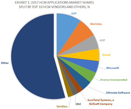 而在人力资本管理方面,市场更加分散,排名前四的是SAP、Workday、ADP、甲骨文,微软则排名第五。