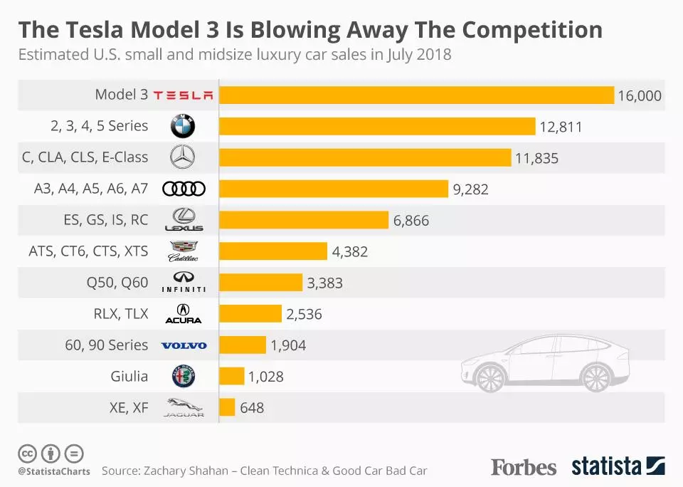 Model 3已经成为公司抢占市场、树立品牌的利器,2018年7月电动车市场销量数据如下图所示,特斯拉Model 3销量遥遥领先。不过,随着经济景气度的下降、车市销量的下滑及传统汽车厂商对电动车投入的增加,特斯拉可能面临更大的压力。近期以来特斯拉降价、裁员等均透露出需求的疲软趋势。