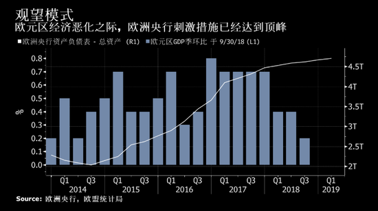 政策制定者在周四的会议后可能会确认,尽管前景有恶化的迹象,但货币政策支持已经达到顶峰。他们的论点是:创纪录的低利率和量化宽松措施下购买的2.6万亿欧元(3万亿美元)公私部门债券会继续促进增长,保持融资环境有利。