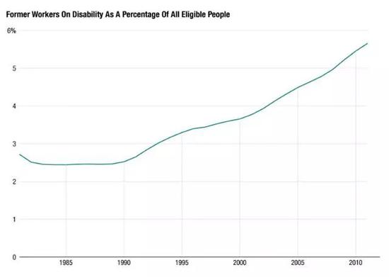 1930年,男性的不活动率(既不工作也不找工作)低于2%。1970年升至4%,然后在2016年爆发至11.5%。只有3%的人是“沮丧的工人” - 那些辍学的人由于对就业市场的沮丧而退出。从1968年到2014年,这个群体的不活动增长不到10%。为什么陡峭上升呢?罪魁祸首似乎是残疾索赔的增加: