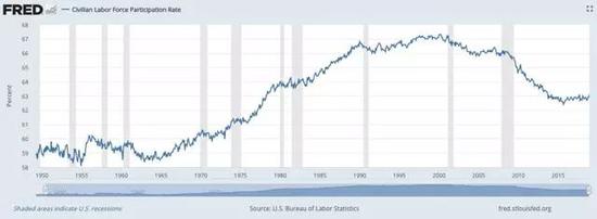 从20世纪50年代到90年代,经过几十年的努力使女性进入劳动力市场,就业人口的参与率已经下降而没有恢复。
